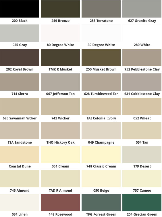 To further help you envision our product’s 36 different colors, we offer the color swatches below. Because every computer and mobile device screen handles darkness and light differently, it is impossible to show you 100% accurate colors. Please contact us for more exact color-matching options, if necessary.